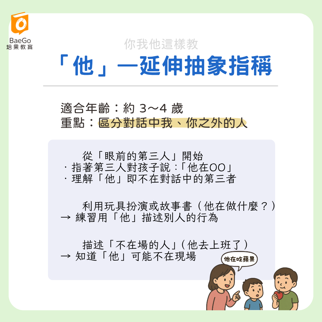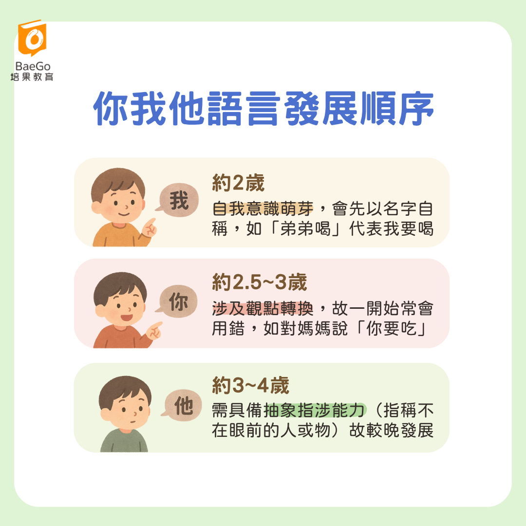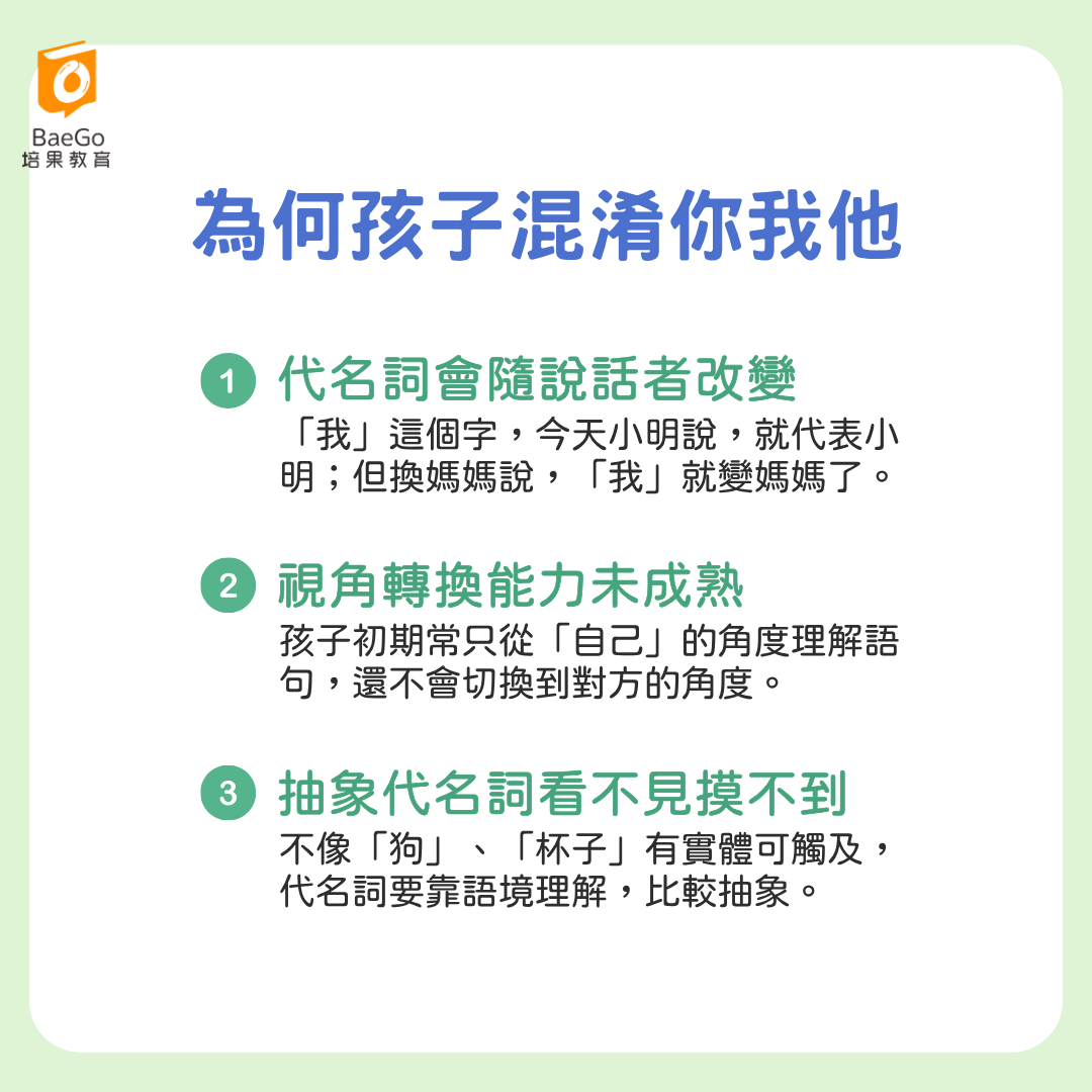 使用這類代名詞需要孩子能:區分對話中的「我」與「你」之外的他人;並具備抽象指涉能力(指一個不在眼前的人或物)。
