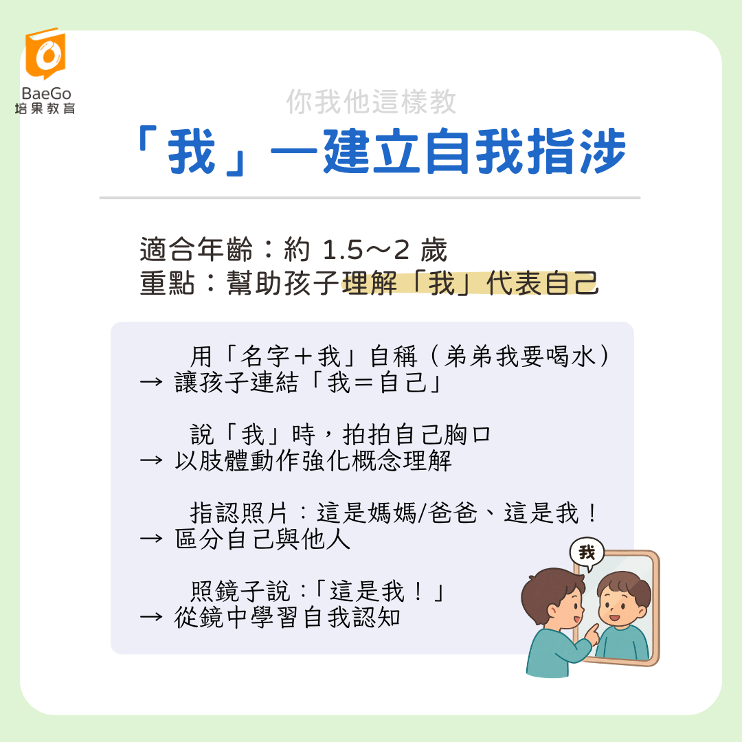 孩子最初習慣以「小名」指自己(如:「弟弟要吃飯」)。透過「名字+我」(如:「弟弟我要吃飯」),能幫孩子從「名字」過渡到「我」、理解「我=自己」。