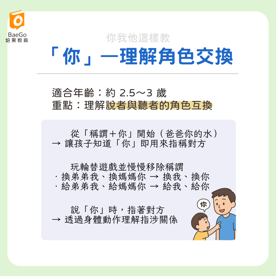 要能正確使用「你」,需要孩子理解「角色對換」的概念:「我」說話時的對象是「你」,但當「你」說話時,「你」又會變成「我」。