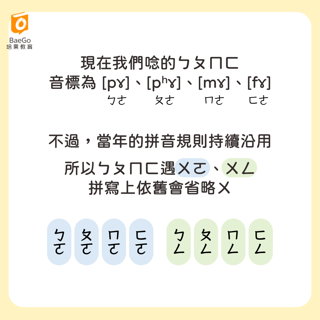 所以當 ㄅㄆㄇㄈ 遇到 ㄨㄛ、ㄨㄥ 時,拼寫上依舊會省略ㄨ。