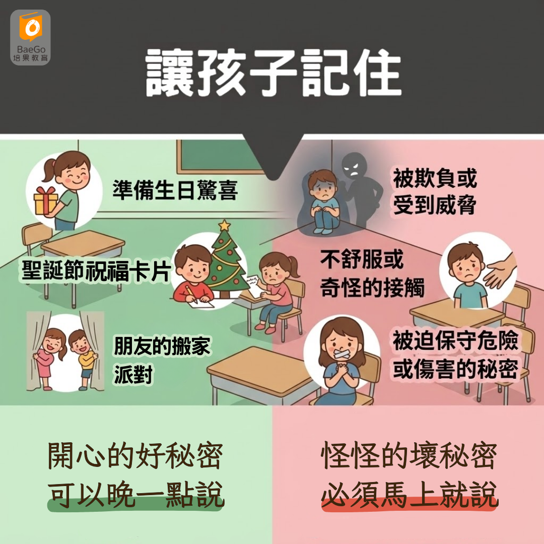 如果有人要求孩子保守秘密,且讓孩子感到恐懼、焦慮或壓力,這就是壞秘密。