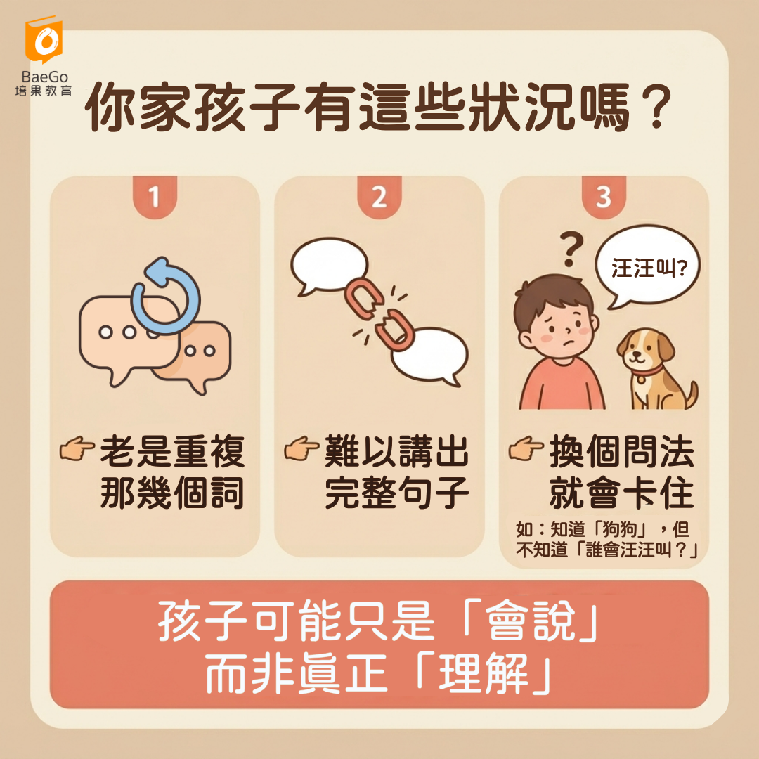 當孩子只是記住一個「聲音」,但沒有建立完整概念時,就會出現:
