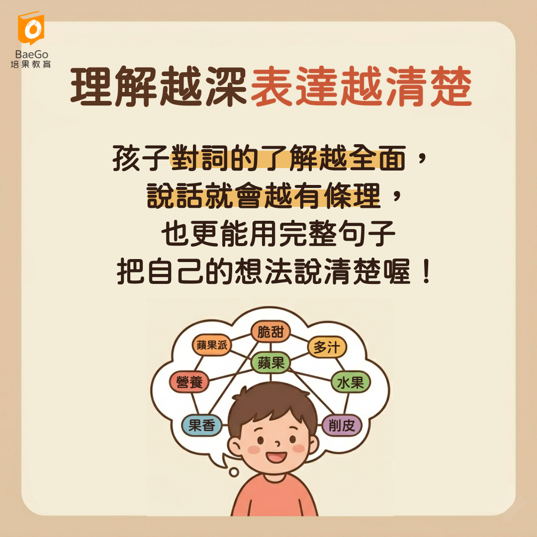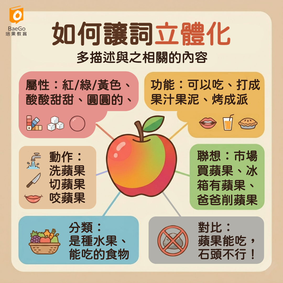 👉 這樣的練習,會讓孩子從「會說蘋果」,變成「真的理解蘋果」。