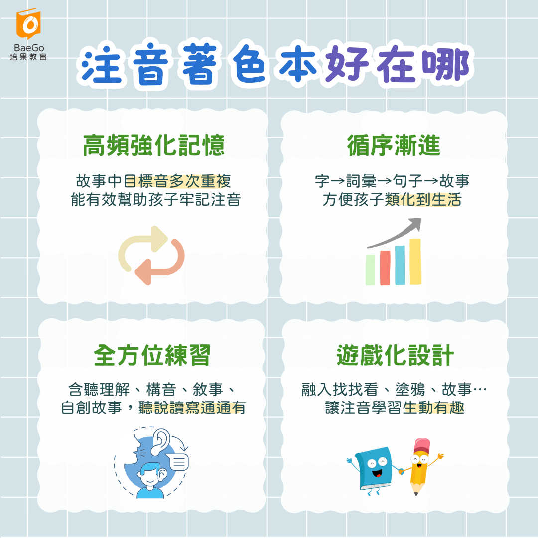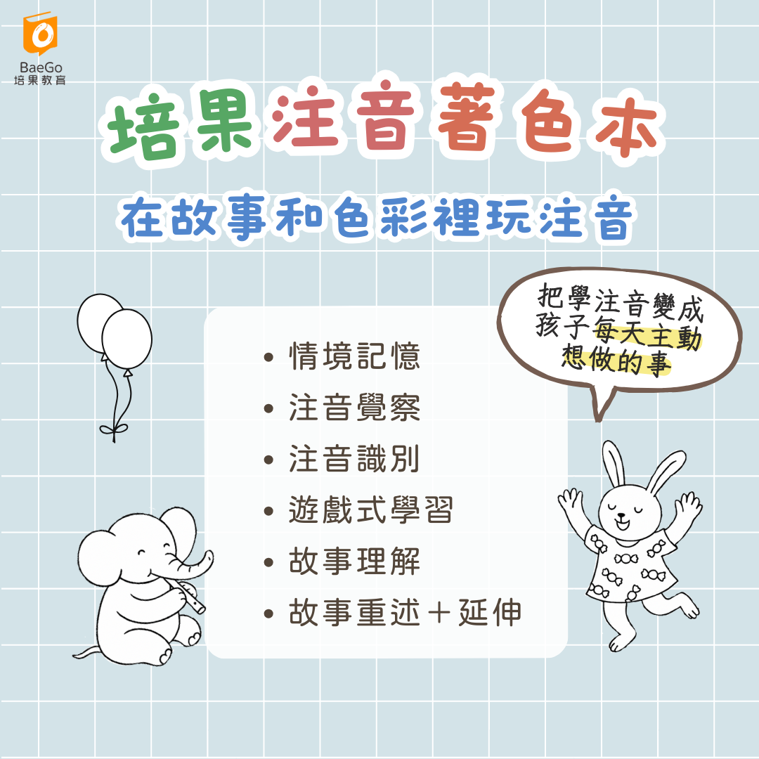 把注音的「學習」悄悄藏進孩子最愛的畫畫、故事與遊戲裡,把學注音變成孩子每天主動想做的事!
