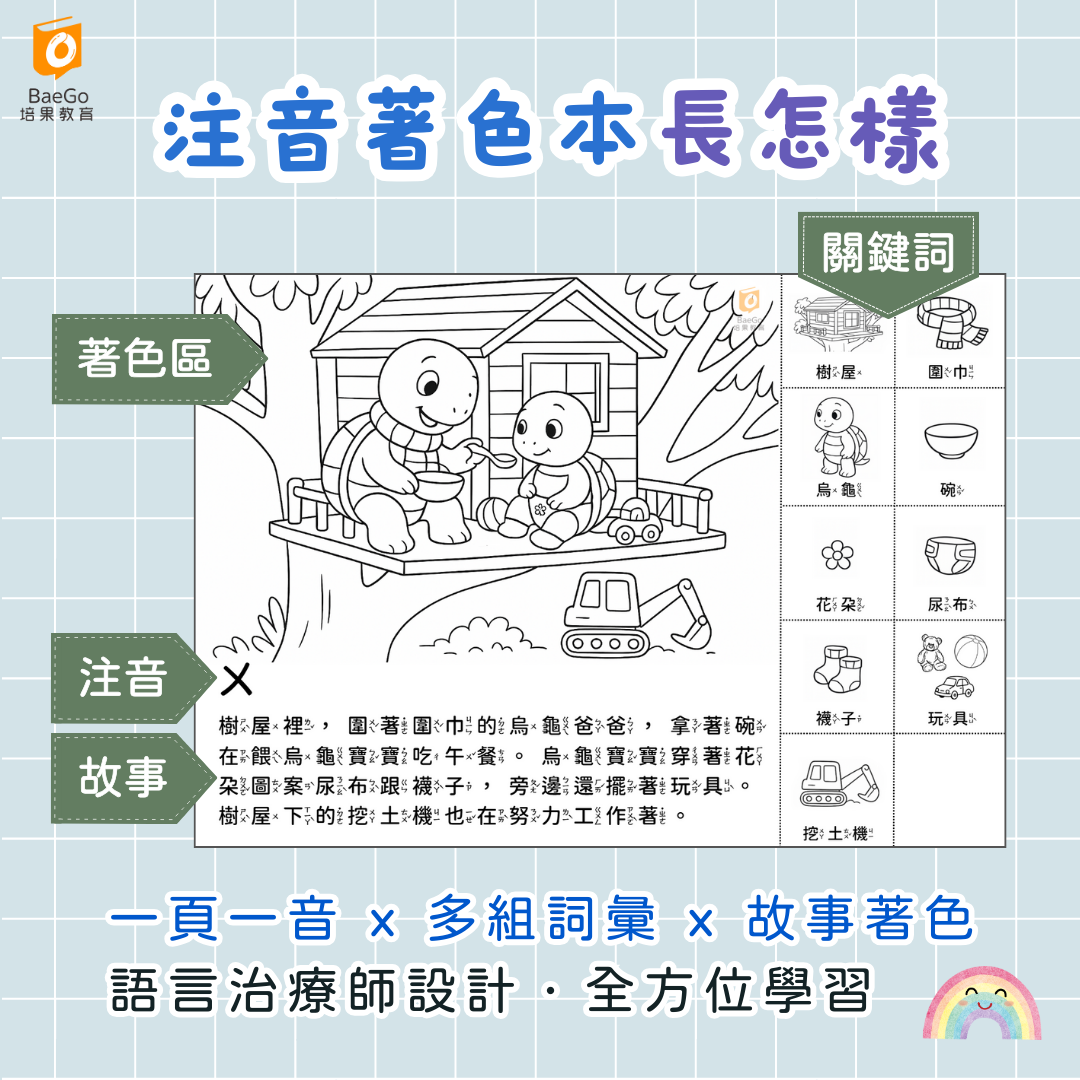 《培果注音著色本》完整呈現注音在不同詞彙位置的例子 ,能幫助孩子建立完整印象。